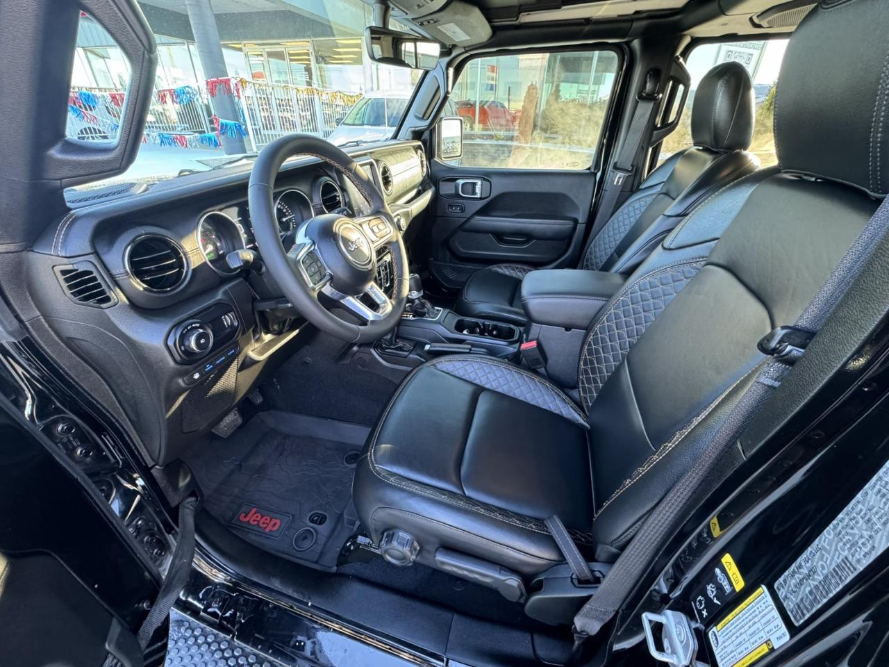 Jeep Wave Customer Care, 2.72:1 Selec–Trac full–time 4WD system, Regenerative 4–wheel anti–lock disc brakes, LED Lighting Group, Uconnect 4C NAV with 8.4–inch display, Alpine premium audio system, Google Android Auto, Apple CarPlay capable, SiriusXM satellite radio capable, Off–Road Information Pages, Selec–Speed control, Dana M210 wide front axle, Dana M220 wide rear axle, Auto–dimming rearview mirror, Premium wrapped instrument panel bezels, Battery charge indicator, Leather–faced bucket seats with Sahara logo, Electronic Stability Control, Traction Control, Electronic Roll Mitigation, Hill Start Assist, Trailer Sway Control, Power, heated exterior mirrors, Automatic headlamps, Remote proximity keyless entry, Security alarm, ParkView Rear Back–Up Camera, Transmission skid plate, Fuel tank skid plate shield, Transfer case skid plate shield, Torx tool kit for top and door removal, Tilt/telescoping steering column, Push–button start, Media hub with USB port and auxiliary input jack, Steering wheel–mounted audio controls, Dual–zone A/C with automatic temperature control, Tire pressure monitoring system, 7–inch, full–colour driver information display, 115–volt auxiliary power outlet, Universal garage door opener